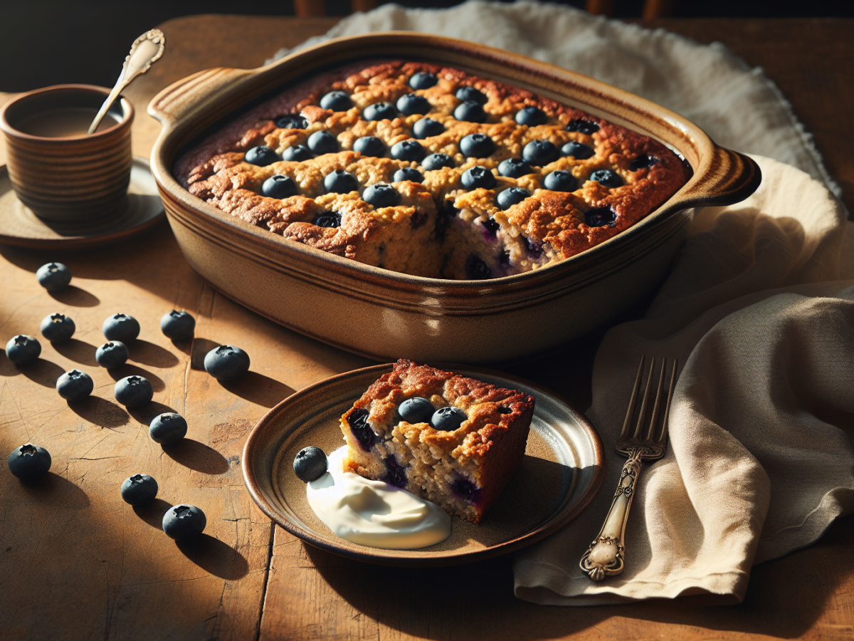 Fadet kommer ud af ovnen med en duft af varm kanel og smeltede blåbær. Toppen er let gylden. Indeni er det blødt, svampet og lidt som en muffin, der har fundet ro i tilværelsen.